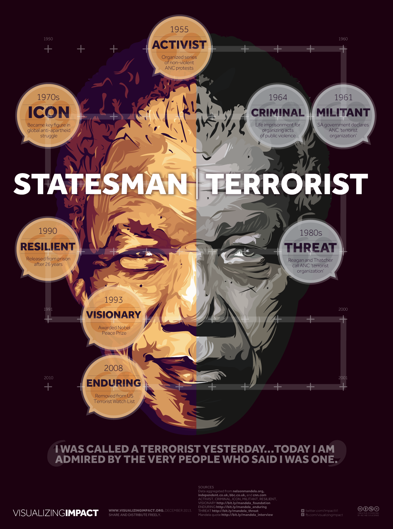 Mandela meant different things to different people at different stages during his lifetime, just as this simplified yet succinct visual so beautifully portrays. As a result, he left something behind for all of us to remember, learn from, and live by, of course, only for those who have the modesty and courage to realize that his life was a life worth remembering, learning from and living like. And this is more so in the Middle East, which provides a live stage for many of the struggles Mandela himself faced in his own country. The most obvious example is apartheid, a system comparable to what Palestinians are being subjected to on a daily basis by Israel. And even though Mandela did engage in violence during his early years, it could be argued that it wasn’t this violence that led to his release and the eventual fall of apartheid. The Palestinian case is certainly not the same as the South African, but lessons are to be learned from the more peaceful methods used by South Africa to bring an end to such an inhumane system.