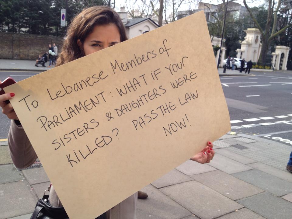 Protesting on every street I happen to be on or trouble making around the globe isn’t something I do regularly. But doing nothing, albeit symbolically, in the face of the rising incidents of deadly family violence in Lebanon, wasn’t an option even from afar. And it pains me to see that it has taken cold-blooded murders to wake us up as the “democratic” society we profess to be to finally call for the most basic of measures to protect our women. It seems rather shameful that at this point in time, we would have to add anything more to this debate, other than the stories of lives of mothers and sisters still torn apart by their daughters’ and sisters’ abuse and/or death, or the silent tears of sons and daughters orphaned by the hands of their fathers and relatives. But that’s a different story altogether…