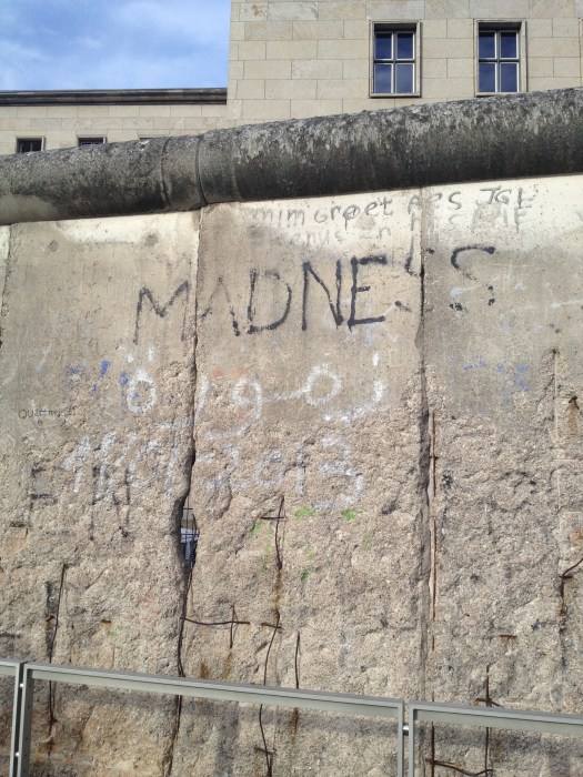 At the same time, there also lingers a feeling of hope: though it is true that it took 28 years for the wall to fall, it eventually did fall. I couldn’t but picture the partly colorful but much taller walls I saw in Belfast, Northern Ireland (see Eye on the East’s post from October 2013), when I walked along the Berlin Wall remains at the East Side Gallery on Mühlenstrasse (see picture below) or Israel’s Apartheid Wall in the West Bank as I walked along the somber remains of the Berlin Wall on Niederkirchnerstrasse (see picture below). The circumstances of each of these walls is different, and times have certainly changed, yet the fall of the Berlin Wall provides if only a glimmer of hope that walls were never meant to last forever…