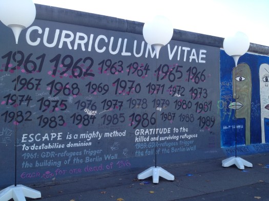 There are many ways to experience the wall and absorb its legacy while walking the wide and never-ending streets of Berlin. One of them is simply to look: at the actual parts of the wall still standing and read the stories from both sides of the divide exhibited throughout the city. By inspecting the relatively modest size and height of the wall and reflecting on the absurdity of how it stood in the way of an entire city. One can also listen to the stories: of those who believed it was useless to celebrate the 25th anniversary because nothing would come out of it and that life moves on, to those that recognized how their lives had changed for the better because of the fall of the wall (usually those from East Berlin), which was reason enough for the commemoration. Some Easterners recount tales of continued discrimination against them and a slight bitterness that everything they held dear in the East had been discredited by the West (such as the educational and welfare systems), but later partly adopted by the West itself. Of course, there is also research that shows that on many levels, Berlin remains a divided city.